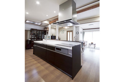 当初、K様はこの台所を広げるお考えでしたが、普段、あまりお使いでない4室の和・洋室を思い切って広いLDKにすることをご提案。キッチンには料理中もみんなで囲めるアイランド型を採用しました。家の歴史を伝える梁や、お父様が作られた欄間を再利用して新しいLDKのシンボルに。数年前にリフォームした浴室も解体、復旧して、バリアフリー化しています。農機具置き場を改装した洋室では、明るい日差しのなかで奥様が趣味を楽しんだり、お孫様が勉強したりされています。