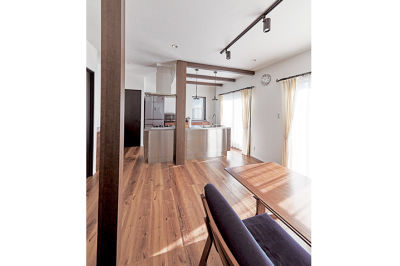 1階のLDKは、チェリー柄の床に合わせて梁を塗装。照明器具は黒で統一してクールな印象に。