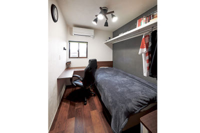 息子さんのデスクは、インテリアカウンターをL字に配して、部屋を広く使えるよう工夫。