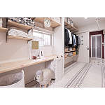 洗面室とリビングにつながる家事室。オープンクローゼットは家族ごとにスペースを。家事デスクに、肌がきれいに見える照明を設置。ゆっくりメイクができます。