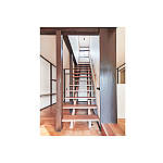 2階からの採光で明るいデザイン階段。ホールには棚を設置し多目的空間に。