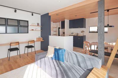 “木”を感じるLDKはネイビーオークのカップボードや壁、ブラックの内窓がアクセントに。