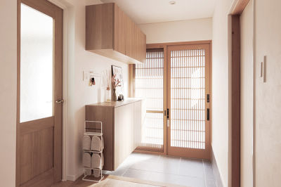 LDKの床は無垢、玄関に続く扉や玄関収納もオーク柄で統一され、温かみのある住まいになりました。設備の色柄を確認するためにお連れしたショウルームで、木目のネイビーオーク柄と真鍮(しんちゅう)色の取っ手に一目惚れされて、カップボードのほか、アトリエの扉にもネイビーオーク柄を選択。スタディコーナー横の壁は、職人が現場でカップボードの扉と色合わせをして塗装した渾身の作で、奥様のお気に入りポイントになりました。