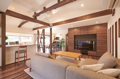 また、足元の段差をなくしたいが、天井は低くしたくないとのことでしたので、天井裏にあった立派な梁をあらわにし、天井を高く開放感と木のぬくもりを感じられるようにしました。