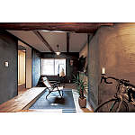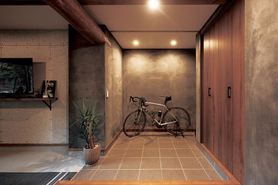 壁面は好みのモルタル仕上げに。趣味のロードバイクをいつでも気兼ねなく整備できます。