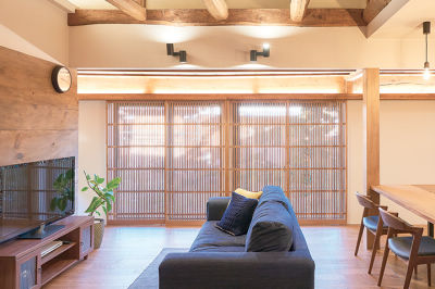 天井や梁など、以前の住まいの素材を残した部分をライトアップ。古き良きものを印象的に見せながら、LDK全体が心地よい明るさになるよう照明設計しました。