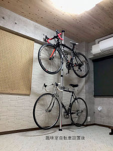 自転車タワーを設置。有孔ボードにはヘルメットやカバン、工具など一式掛けられます。