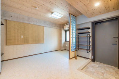玄関入った直ぐの居室の壁を取り壊し、玄関から続くオープンな趣味室を造りました。ご夫婦2人の趣味【自転車】ロードバイクの保管場所と自転車に関わるアイテムを【有孔ボードで】飾る収納として楽しめます。