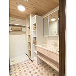 洗面所の天井は調湿効果のある国産の無垢材。壁にエコカラット。お風呂上がりの湯気も気になりません。造付けの収納棚と洗面化粧台にスペースができたので、幅30㎝のキャビネットを追加、更に収納スペースが増えました。