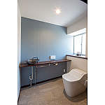 上品な陶器の手洗いにブラックの水栓をしつらえ、洗練されたトイレ空間。今後車いすでも使用できるように、トイレ前には車いすの回転に十分なスペースを設け、開口幅も確保。手摺を取付できるように壁には補強材を入れています。