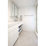 真っ白な清潔感のある洗面空間、もちろん収納たっぷりです。