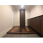 上枠がなく天井までつながるドアが開放感のあるすっきりとした空間をつくります。左手の室内ドアはベリティス、真っ白なドアが清潔感とクロスと一体感をつくります。右手の玄関収納はフロートタイプを選び、足元にスペースをつくることで実際よりも空間を広く見せる効果、軽くおしゃれな空間にしています。