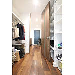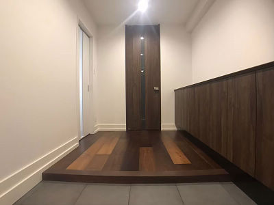 上枠がなく天井までつながるドアが開放感のあるすっきりとした空間をつくります。左手の室内ドアはベリティス、真っ白なドアが清潔感とクロスと一体感をつくります。右手の玄関収納はフロートタイプを選び、足元にスペースをつくることで実際よりも空間を広く見せる効果、軽くおしゃれな空間にしています。