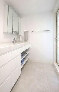 真っ白な清潔感のある洗面空間、もちろん収納たっぷりです。