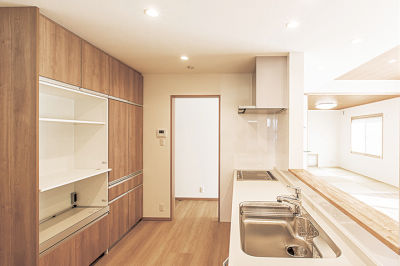 作業をしていても後ろを通れるようにキッチンの通路幅を広く。ふたり並んでもお料理ができます。