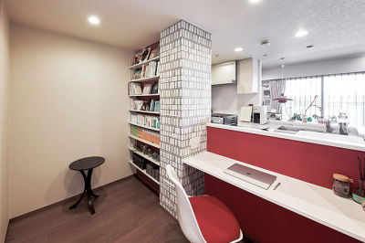 LDKと隣接する洋室をL字の大きな室内窓を設置してこもれる自宅オフィスに変身。落ち着いたウォールナットのオフィスで仕事もはかどります。透明ガラスの窓からは仕事中もリビングの家族の様子を感じられます。また、キッチン裏の柱を活用し、読書家の奥様の憧れ「飾れる本棚」を形に。ご夫婦が個々に有意義な時間を過ごせる場所をつくりました。