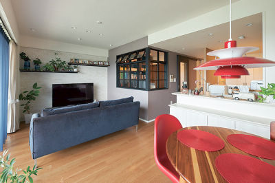 リビングはネイビー、キッチン・ダイニングは赤とテーマカラーを決めてハイセンスな空間を演出。在宅ワークにも適合した新しい住まいを実現しました。