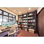 LDKと隣接する洋室をL字の大きな室内窓を設置してこもれる自宅オフィスに変身。落ち着いたウォールナットのオフィスで仕事もはかどります。透明ガラスの窓からは仕事中もリビングの家族の様子を感じられます。また、キッチン裏の柱を活用し、読書家の奥様の憧れ「飾れる本棚」を形に。ご夫婦が個々に有意義な時間を過ごせる場所をつくりました。