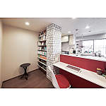 LDKと隣接する洋室をL字の大きな室内窓を設置してこもれる自宅オフィスに変身。落ち着いたウォールナットのオフィスで仕事もはかどります。透明ガラスの窓からは仕事中もリビングの家族の様子を感じられます。また、キッチン裏の柱を活用し、読書家の奥様の憧れ「飾れる本棚」を形に。ご夫婦が個々に有意義な時間を過ごせる場所をつくりました。