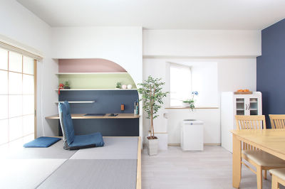 中古マンションを購入されたM様。ご夫婦の在宅ワーク中も快適に暮らせる住まいへとリフォーム。暮らしの中心となるLDKのポイントは、デスクワークにも使えるカウンターを備えた畳コーナー。畳の質感や壁紙の貼り分けが目にも楽しいワークスペースです。畳の下の大容量の収納のおかげでLDKはいつもスッキリ片付きます。ホワイトとネイビーをテーマカラーに、内装をコーディネイトし、キッチンにはネイビーを採用。二間続きだったリビング横の和室は将来、子ども室にできるよう独立した洋室に。現在は、トレーニングルーム、映画やゲームを楽しむ趣味室として活用されています。家全体の収納と動線を見直してキレイと安心をキープでき、家での時間を楽しめる素敵な住まいになりました。