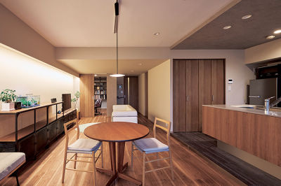 梁を隠すために天井を下げても、ダウンライトの採用などで天井の圧迫感を抑えられ、すっきりとしたシンプル空間を実現。腰掛パネルと建具の色を合わせることで、キッチンが家具のような装いに。