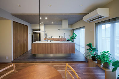 壁に囲まれたクローズドキッチンは窓側に移動し、オープンなアイランドタイプに。排水管と排気ダクトのスペースを確保するため、あえて床を上げ、天井を下げました。梁の存在感をなくし、凹凸をつくらずフラットな面に仕上げたことで、空間がすっきりとしました。