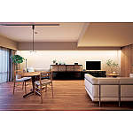 壁側の梁は垂れ壁を造作して隠し、間接照明をプラス。美しい光のラインが浮かび上がり、空間をあたたかく照らしながら、スタイリッシュな印象を与えます。カーテンボックスは垂れ壁のラインと合わせて造作。壁をくり抜いて作ったかのような一体感のあるデザインに。綿密な色彩計画と直線を活かした空間設計でインテリアを整理し、広がり感と落ち着き感を両立。ご夫婦ふたりが豊かに暮らせるシンプルで美しい住まいが生まれました。
