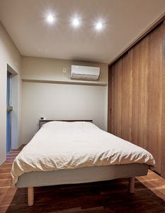 個室はベッドが置ける最小限のスペースで。エアコンの配管も壁面に隠してすっきり。
