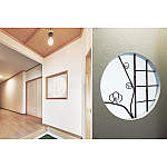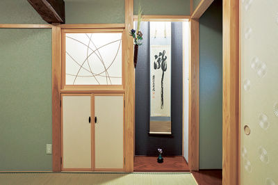 にじり口に見立てた物入れの上には、オリジナルの地模様を描いた、けんどん障子。照明を点けるとやわらかに浮かび上がる。床の間は生け花や掛け軸が映える壁紙を選択。
