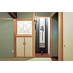 にじり口に見立てた物入れの上には、オリジナルの地模様を描いた、けんどん障子。照明を点けるとやわらかに浮かび上がる。床の間は生け花や掛け軸が映える壁紙を選択。
