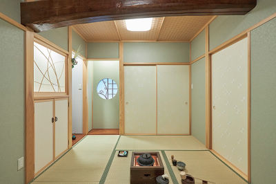 築百年以上の歴史ある母屋につながる厩舎だった土間部分を数寄屋造りに使われる部材などを使用し、床の間や飾り障子を配した本格的なしつらえに。立派な梁や柱など趣ある部分は残し、新しい部材と融合するよう設計しました。さらに茶室に隣接する車庫に裏玄関を設け、母屋へつながる動線を確保。「帰宅して駐車後、外に出ることなく母屋に行けるので荷物が多いときもラクになりました」。お子様が独立され「これからは自分の楽しみも大切にしたい」という奥様の夢が実現しました。
