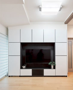 “スピーカー付き照明”と大画面テレビでホームシアターを楽しみたいと決めておられたご主人。リビングがすっきり片付くように大容量収納「キュビオス」をご提案しました。美しいホワイトの扉で統一感のあるインテリアに。「カフェみたいに音が降ってくる」と、感動され、映画鑑賞や誕生日会、クリスマス会を楽しんでおられます。