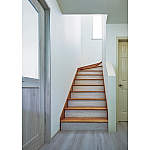 白基調で仕上げた玄関ホールとの調和を考え、階段の蹴込み部分を白い木材で仕上げています。