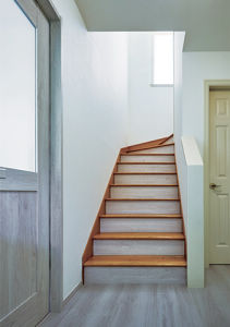 白基調で仕上げた玄関ホールとの調和を考え、階段の蹴込み部分を白い木材で仕上げています。