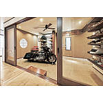 透明ガラスの大型間仕切りでリビングとインナーガレージをひとつの空間に。調光調色可能なダウンライトでシーンに合わせてバイクの表情が楽しめます。
