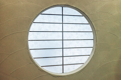 物干し空間とインナーガレージの壁には透かし模様の入った丸窓を。光の加減で紅葉の図柄が浮かび上がるという遊び心も。