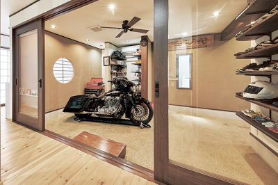 ご主人の願いを叶えるとともにモダンな和風旅館風の丸窓や珪藻土の壁、洗い出しの床、室内物干しスペースなど奥様のリクエストも実現。奥様もお子様もバイクを身近に感じ、興味を持たれるようになり、一挙両得なリフォームとなりました。