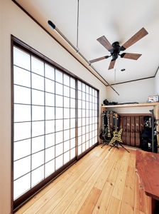 障子を再活用してしつらえた、物干し専用空間。急な来客でも、LDKからは見えないので洗濯物を干したままでも安心です。