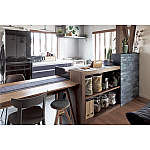 時代や生活の変化に伴って、この先も愛犬と一緒に楽しく暮らしたいと、思い切ってリフォームされたI様。和室をなくし、1階をワンフロアの大きなLDKに。キッチンの向きを変えてⅡ型にしたことで、「前は孤独に料理をしていたけれど、テレビを見たりおしゃべりしながら家事ができる」と、奥様も満足されています。取れない柱や筋交いと梁を同色で塗装して一体感を持たせ、大きな窓にはウッドのルーバーを。家具やクロスのネイビーをアクセントに、“木”とバランスのいい上品な空間に仕上げました。