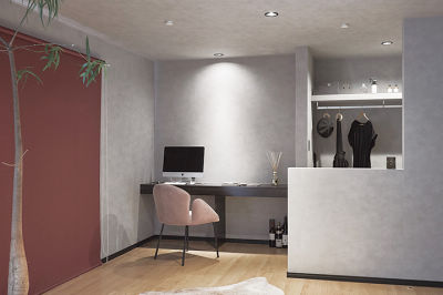 キッチンは自らカフェの厨房に立つH様が使い慣れた厨房機器を選択。メタルな質感が映えるアイランドスタイルに。開放感を高めるためLDKに隣接する寝室の壁は、縦格子の建具でゆるやかに仕切りました。照明はすべて集光タイプで、陰影のある空間を演出。コンクリート調の壁は、年を重ねても違和感のない色調のものを選び、落ち着いた印象に仕上げました。