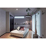 キッチンは自らカフェの厨房に立つH様が使い慣れた厨房機器を選択。メタルな質感が映えるアイランドスタイルに。開放感を高めるためLDKに隣接する寝室の壁は、縦格子の建具でゆるやかに仕切りました。照明はすべて集光タイプで、陰影のある空間を演出。コンクリート調の壁は、年を重ねても違和感のない色調のものを選び、落ち着いた印象に仕上げました。