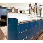 ネイビーのキッチンはリビングのブルー壁とマッチ!使いやすくて大好評。