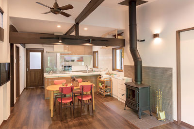 勾配や高さに変化をつけた天井で、開放感のあるLDK。薪ストーブやシーリングファンで快適性を高めたくつろぎの空間に。