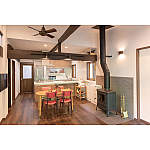 勾配や高さに変化をつけた天井で、開放感のあるLDK。薪ストーブやシーリングファンで快適性を高めたくつろぎの空間に。