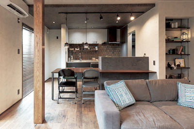 ご夫婦のお好みのヴィンテージ感をLクラスキッチンの扉デザインで表現し、LDK全体の意匠性にも配慮しました。
