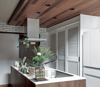 奥様こだわりの 大容量収納は、白いルーバーでお洒落に。