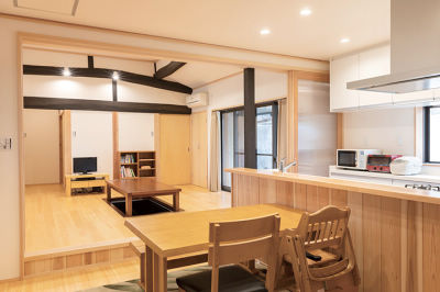 木をふんだんに使ったぬくもりあるLDK。床は足ざわりのよいヒノキを採用。料理をする奥様と、リビングの家族との目線を近づけるためキッチンの床を一段低く設計。