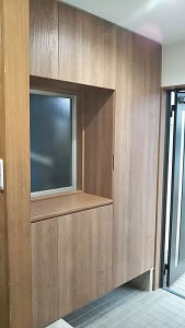 窓は塞がない様に設計し換気も出来、置台としても活用できるようにしました。分電盤もこの中に収められており、スッキリしたデザインの玄関となりました。