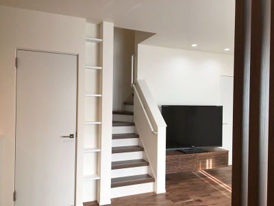 リビング階段も踏板をリフォーム用上貼りの物を使用し色を統一させました。