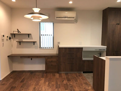 コロナ禍でテレワークのことを考えて、キッチン横にデスクワークやお子様の勉強が見れるようにデスクを併設しました。ウォールナットの無垢材の床をメインに壁、天井はスッキリとさせました。